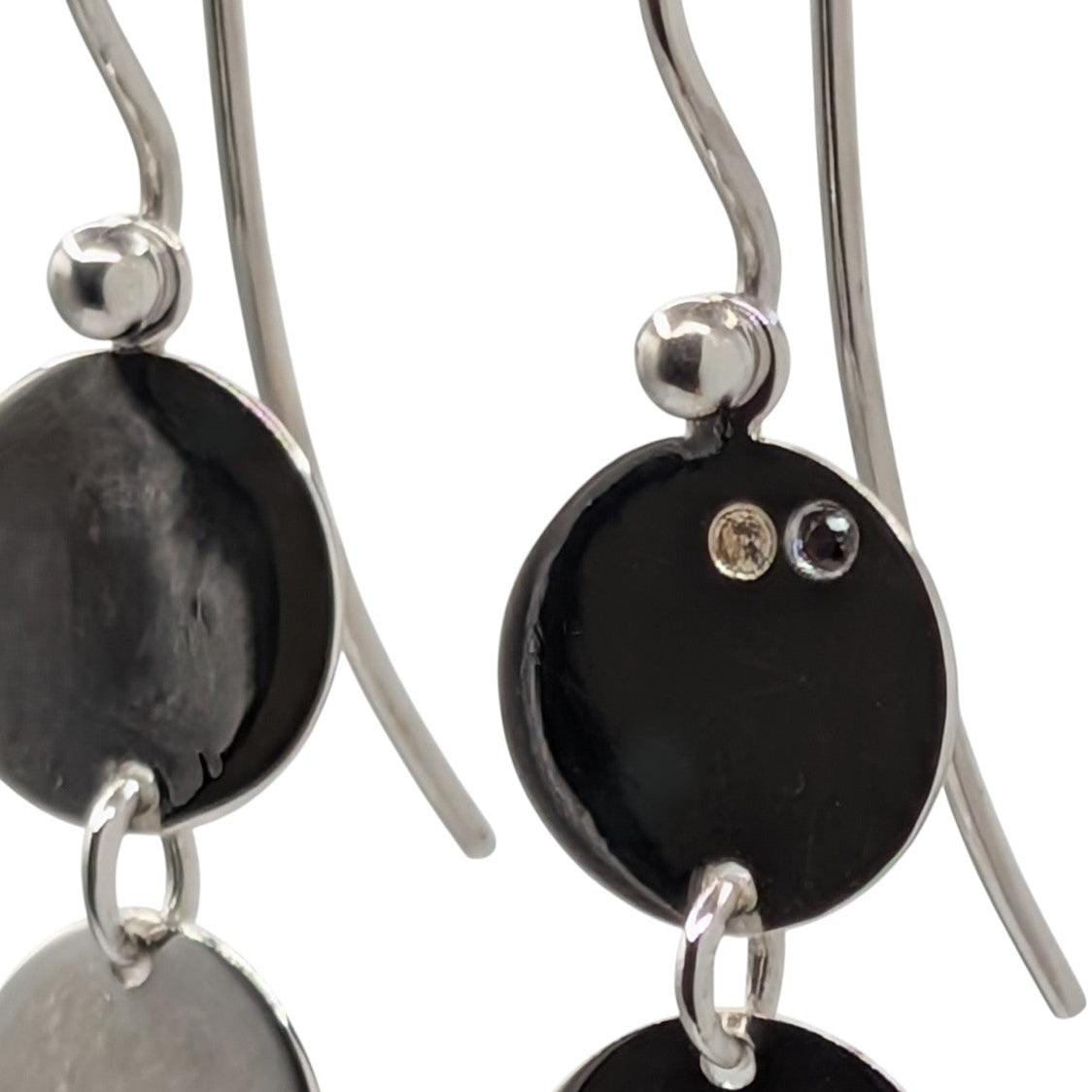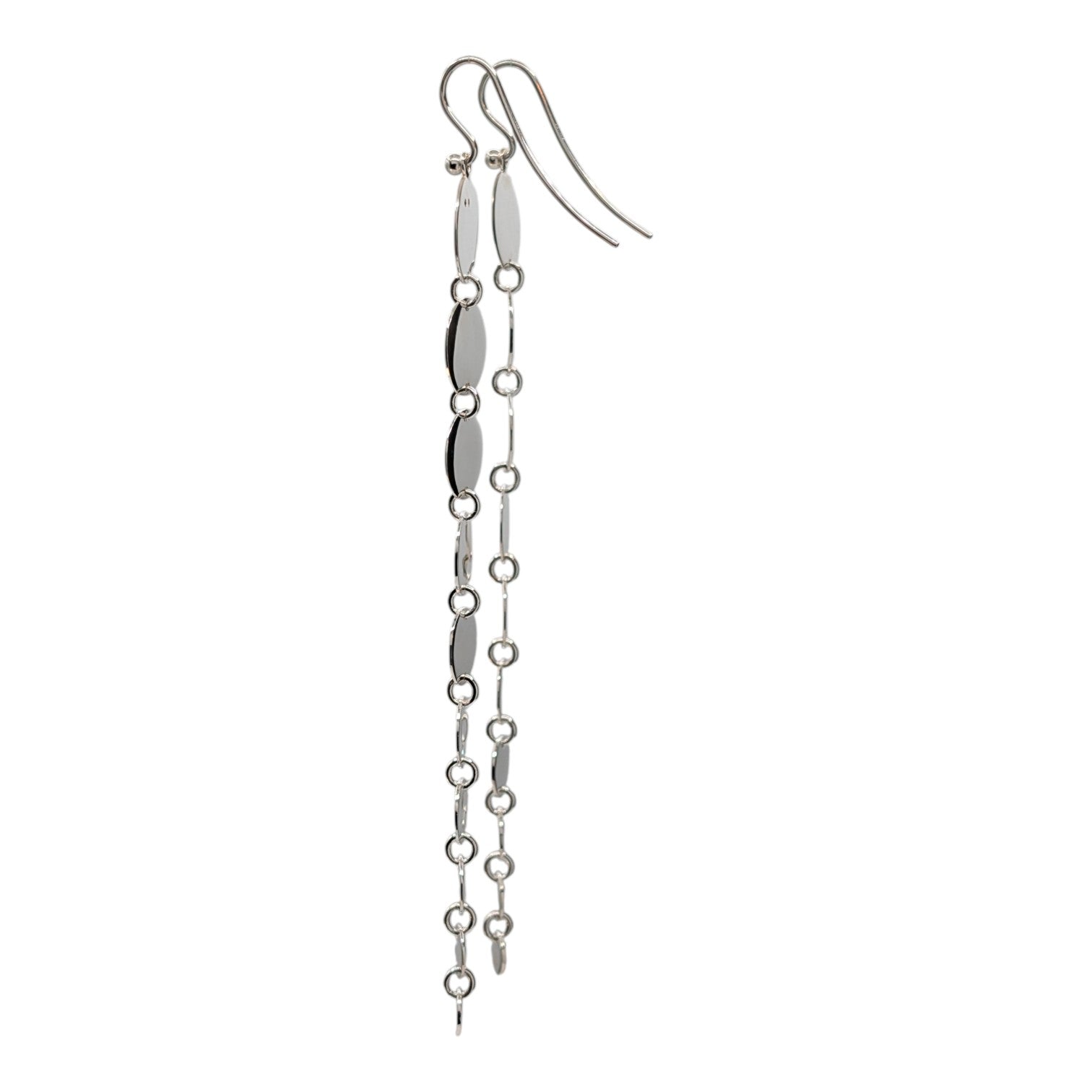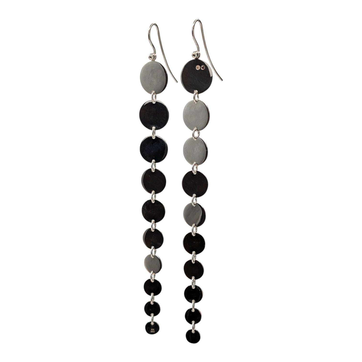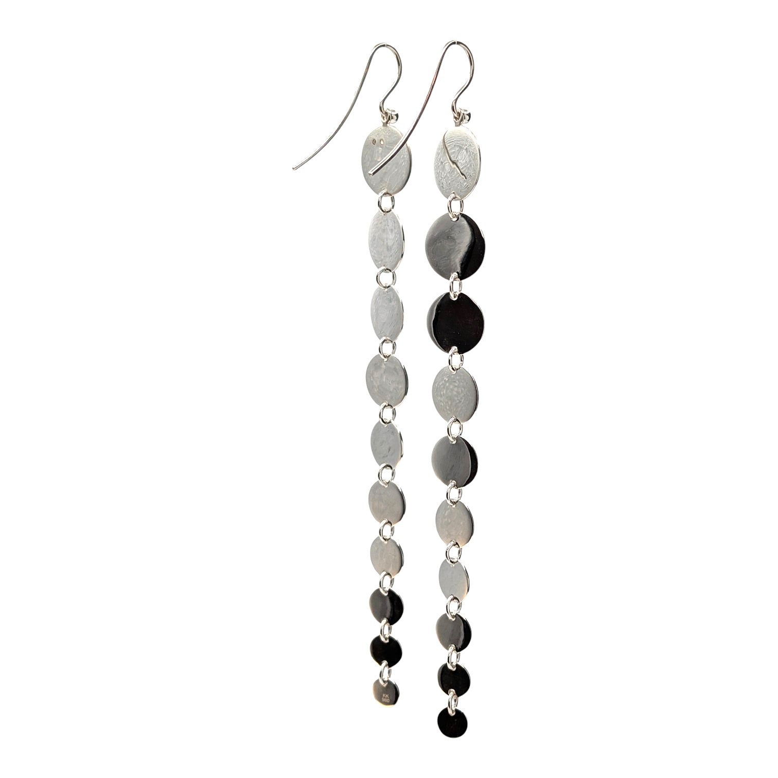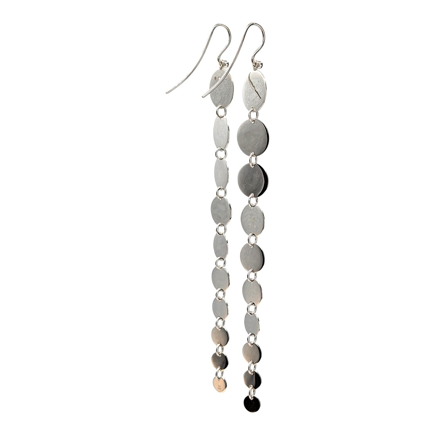 Diese markanten, länglichen Ohrringe bestechen durch ein Spiel aus mehreren fein gearbeiteten Silberscheiben. Vertikal und beweglich miteinander verbunden, folgen sie sanft jeder Bewegung. Die klare Linienführung und die reduzierte Formensprache verleihen diesem Schmuckstück eine ruhige, aber dennoch kraftvolle Präsenz.