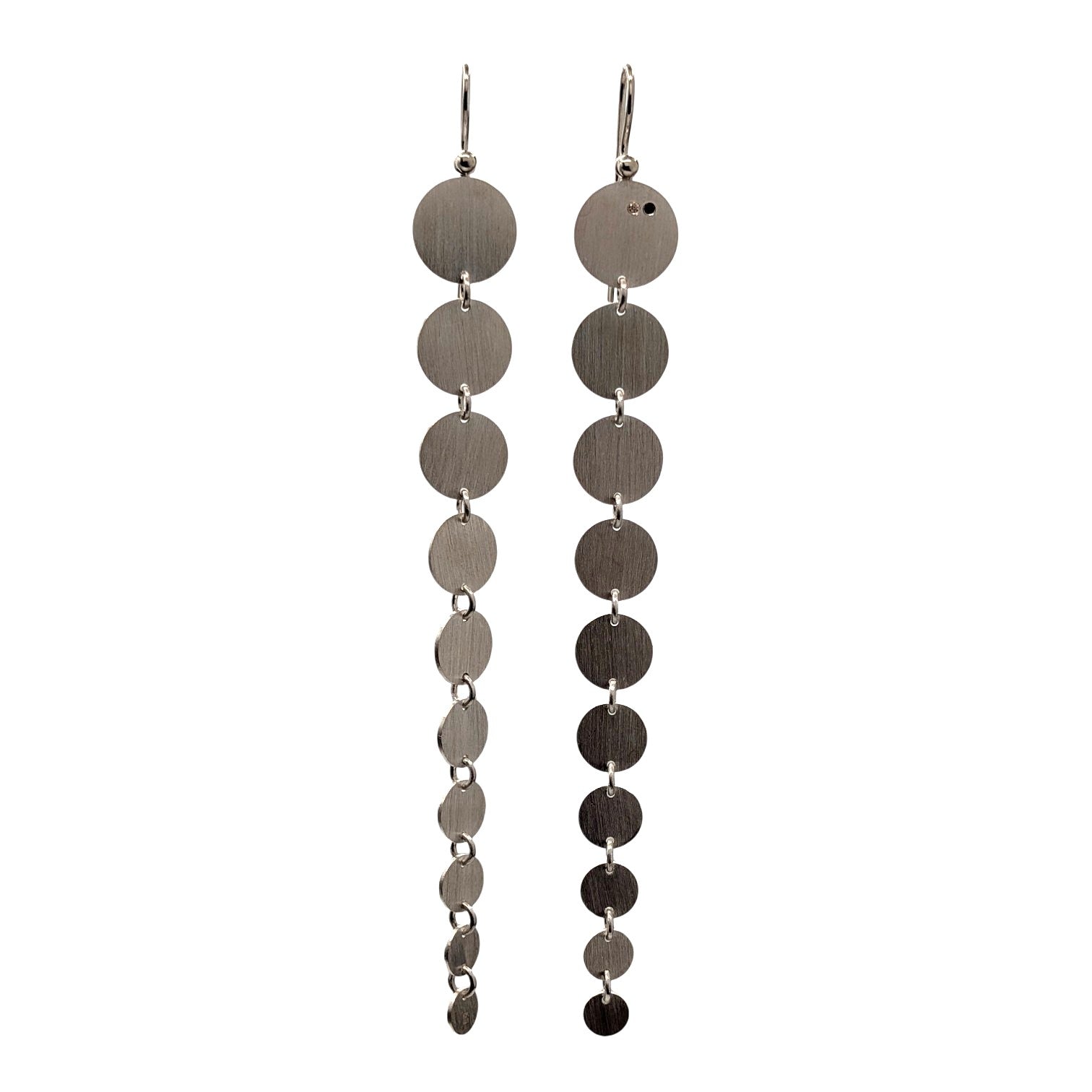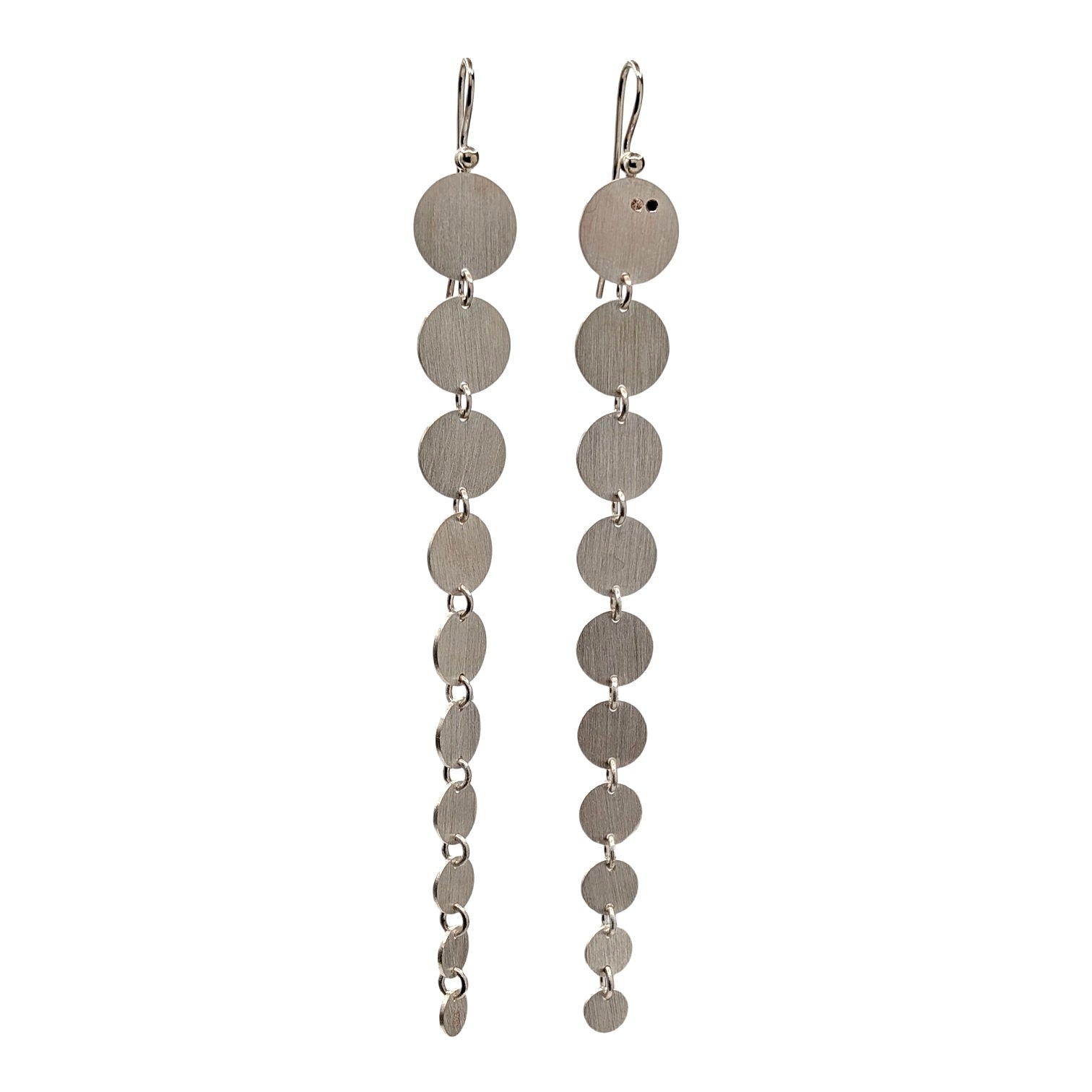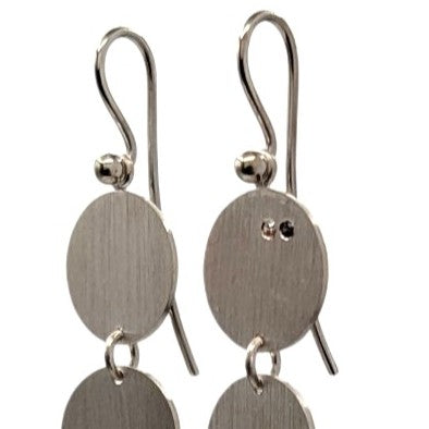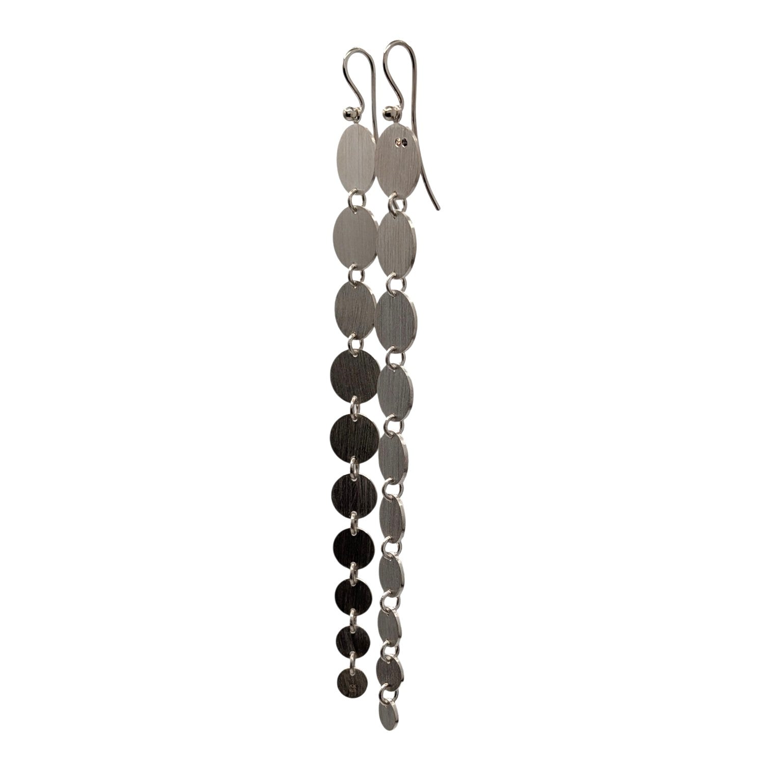 Diese markanten, länglichen Ohrringe bestechen durch ein Spiel aus mehreren fein gearbeiteten Silberscheiben. Vertikal und beweglich miteinander verbunden, folgen sie sanft jeder Bewegung. Die klare Linienführung und die reduzierte Formensprache verleihen diesem Schmuckstück eine ruhige, aber dennoch kraftvolle Präsenz.