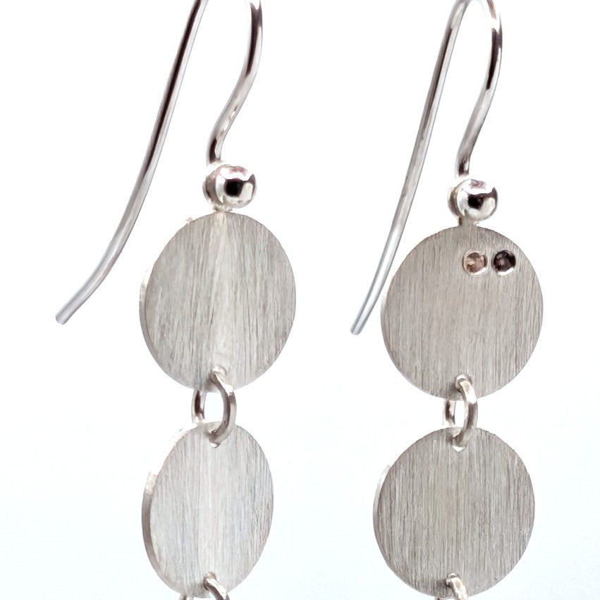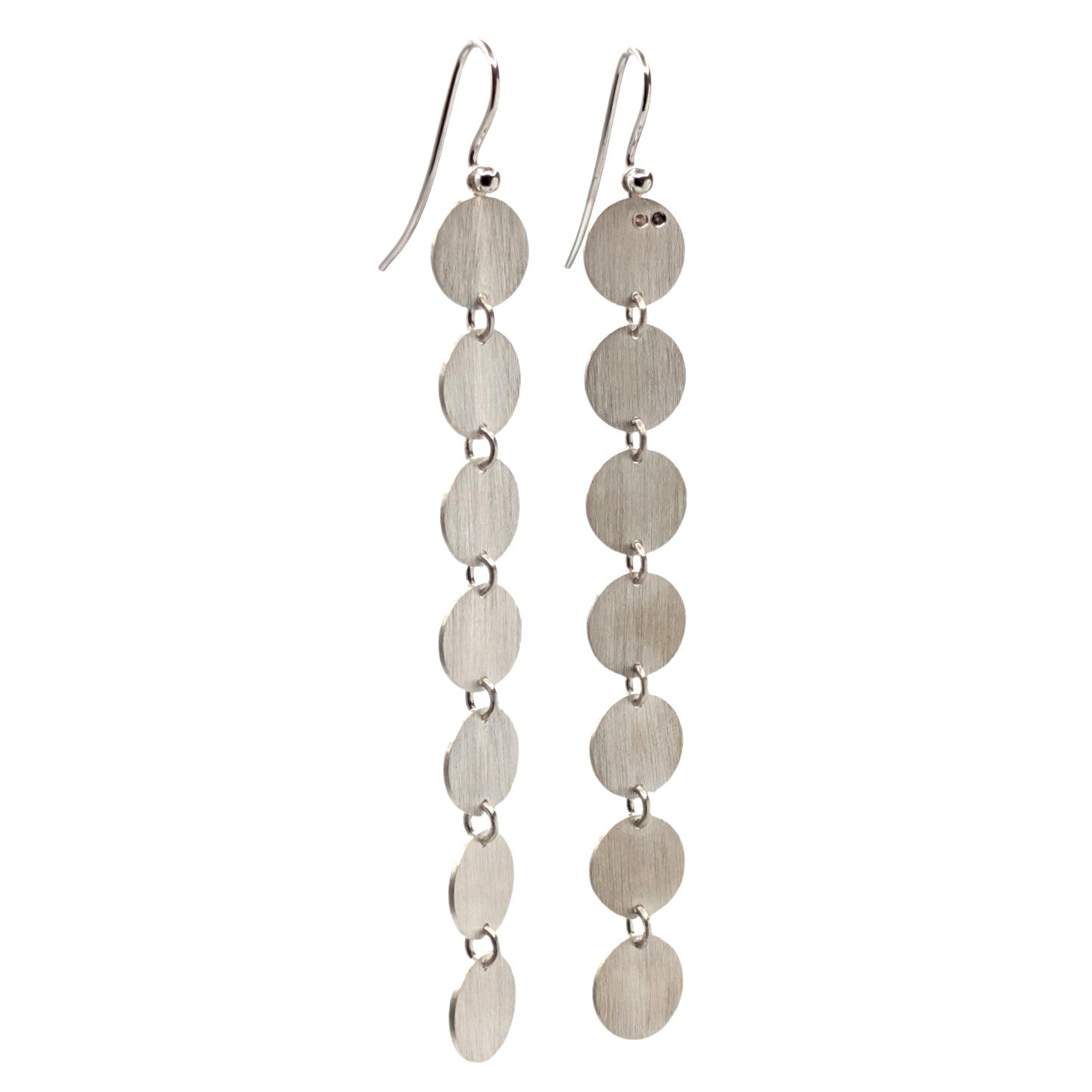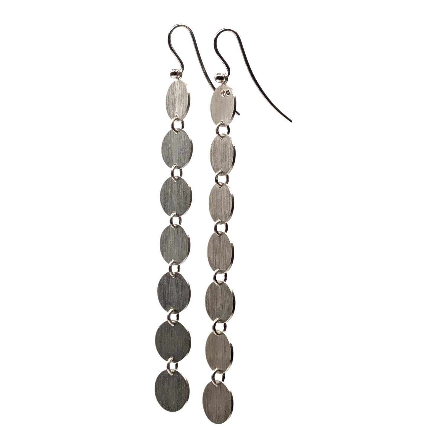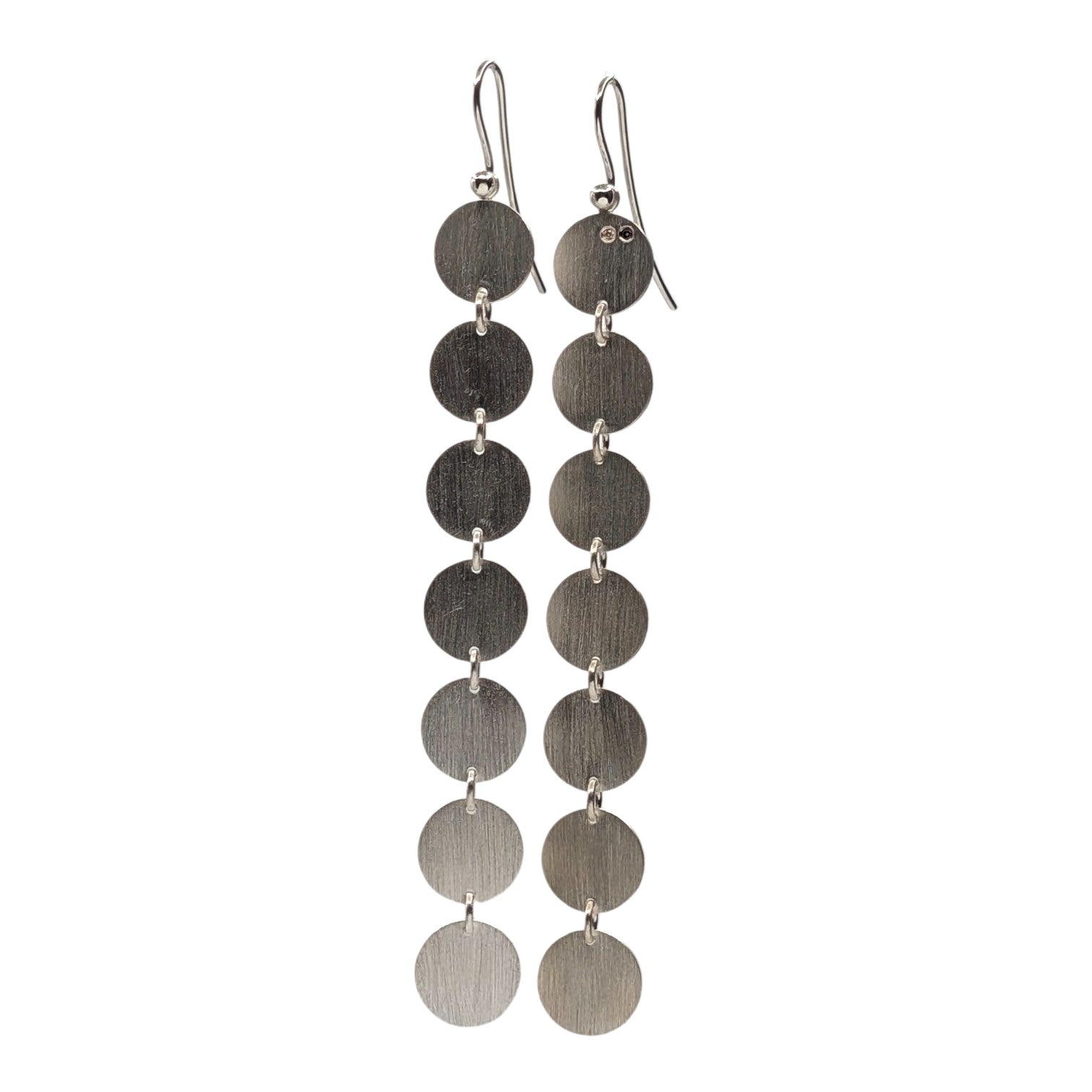 Diese markanten, länglichen Ohrringe bestechen durch ein Spiel aus mehreren fein gearbeiteten Silberscheiben. Vertikal und beweglich miteinander verbunden, folgen sie sanft jeder Bewegung. Die klare Linienführung und die reduzierte Formensprache verleihen diesem Schmuckstück eine ruhige, aber dennoch kraftvolle Präsenz.