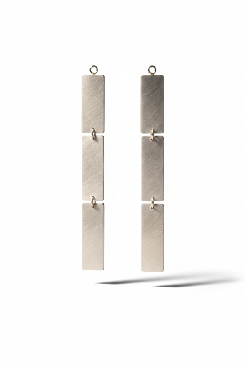 Diese länglichen Ohrringe bestehen aus mehreren fein gearbeiteten Silberscheiben, die vertikal und beweglich miteinander verbunden sind. Die klare Linienführung und die reduzierte Formensprache verleihen den Ohrringen eine ruhige, zeitlose Präsenz am Ohr.
