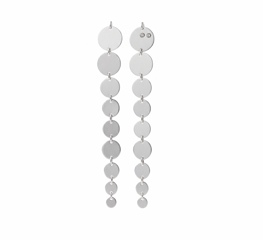 Diese länglichen Ohrringe bestehen aus mehreren fein gearbeiteten Silberscheiben, die vertikal und beweglich miteinander verbunden sind. Die klare Linienführung und die reduzierte Formensprache verleihen den Ohrringen eine ruhige, zeitlose Präsenz am Ohr.